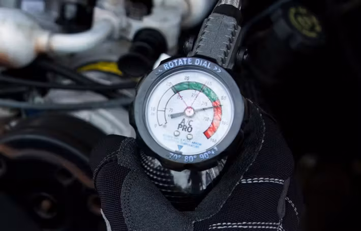 Before adding A/C Pro, one of the first steps is to use the A/C Pro gauge (which can be bought separately) to check the system pressure. The gauge measures the low-pressure (or suction) side of the A/C system. When the compressor is running, it should create suction and lower the pressure reading. Note that when the compressor is not running, it’s normal for the gauge to show a high reading.