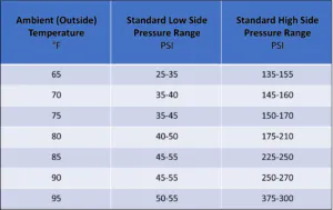 Ambient temperature is simply the temperature of the air surrounding the car. The following automotive A/C chart outlines the proper pressure readings for a particular temperature range. For instance, if the ambient temperature (outdoor temperature) is 75°, the corresponding low side pressure should be between 35-45 psi and if needed the corresponding high side pressure would be between 150-170 psi.